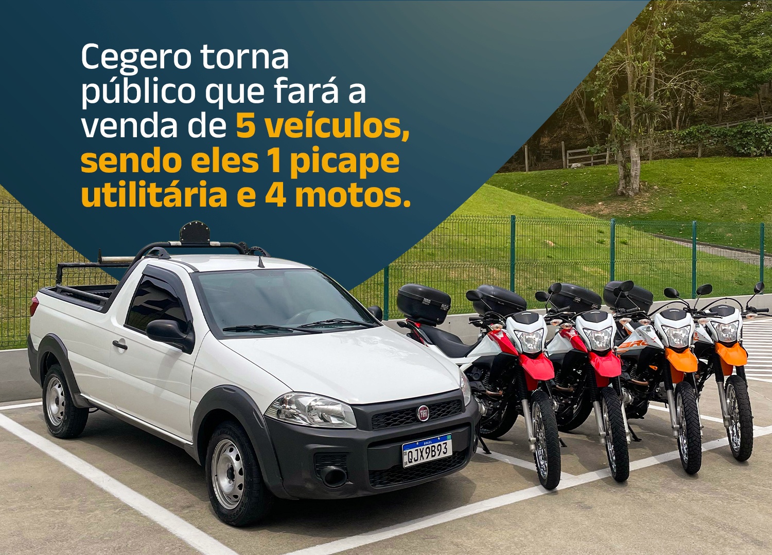 A Cooperativa de Eletricidade de São Ludgero - CEGERO torna pública a venda de cinco veículos, sendo eles uma picape utilitária e quatro motos, conforme as condições a seguir: