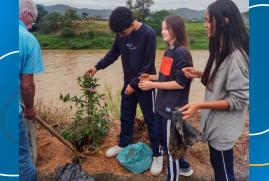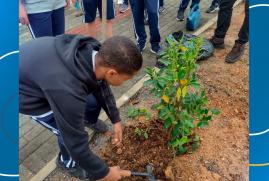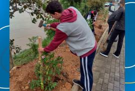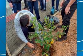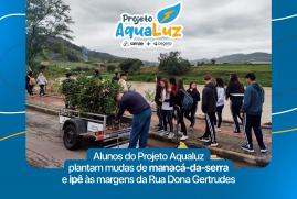 Alunos do Projeto Aqualuz plantam mudas de manacá-da-serra e ipê às margens da Rua Dona Gertrudes