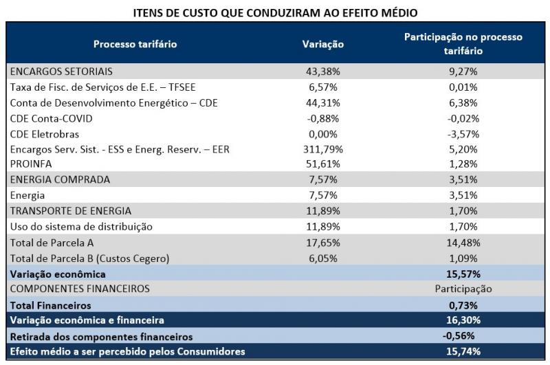 O efeito médio do reajuste a ser percebido pelos consumidores será de 15,74%. Para os consumidores faturados em Baixa Tensão o efeito médio será de 19,65%, sendo de 18,14% para os consumidores residenciais. Já para os consumidores faturados em Alta Tensão o efeito médio será de 14,71%.
