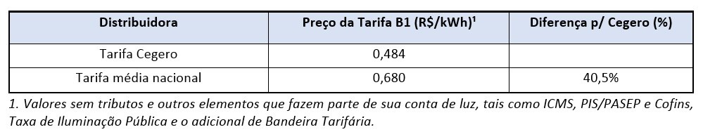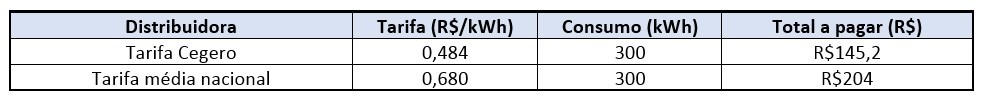 De forma a demonstrar de maneira prática a aplicação das tarifas, a seguir apresentamos a aplicação da tarifa B1 residencial (tarifa de referência) praticada pela Cegero, comparando-a com a tarifa média nacional. Ambas as tarifas sem o acréscimo de bandeiras tarifárias e ICMS.