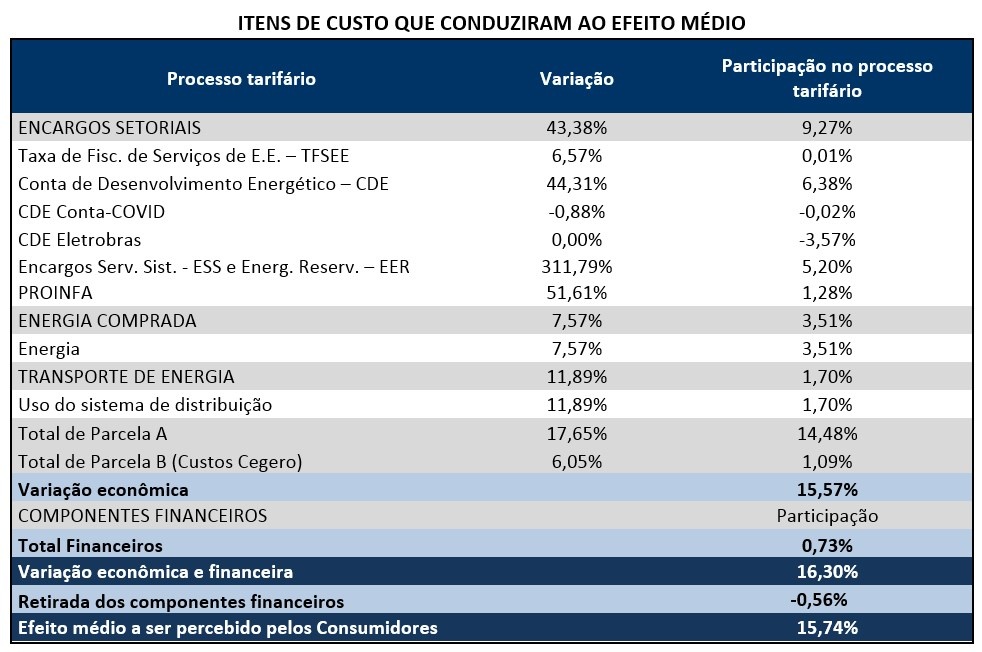 Dentre os itens que mais impactaram este processo, destacam-se os encargos setoriais, custos com aquisição e com transporte de energia. Somente os encargos setoriais representaram um efeito econômico de 9,27%, com destaque para a CDE-USO, cujo efeito foi de 6,38%, decorrente do cálculo das cotas anuais de CDE para o ano de 2022, e para o Encargo de Serviço de Sistema e Encargo de Energia de Reserva (ESS/EER), cujo impacto foi de 5,20%.