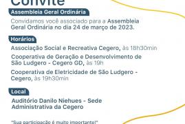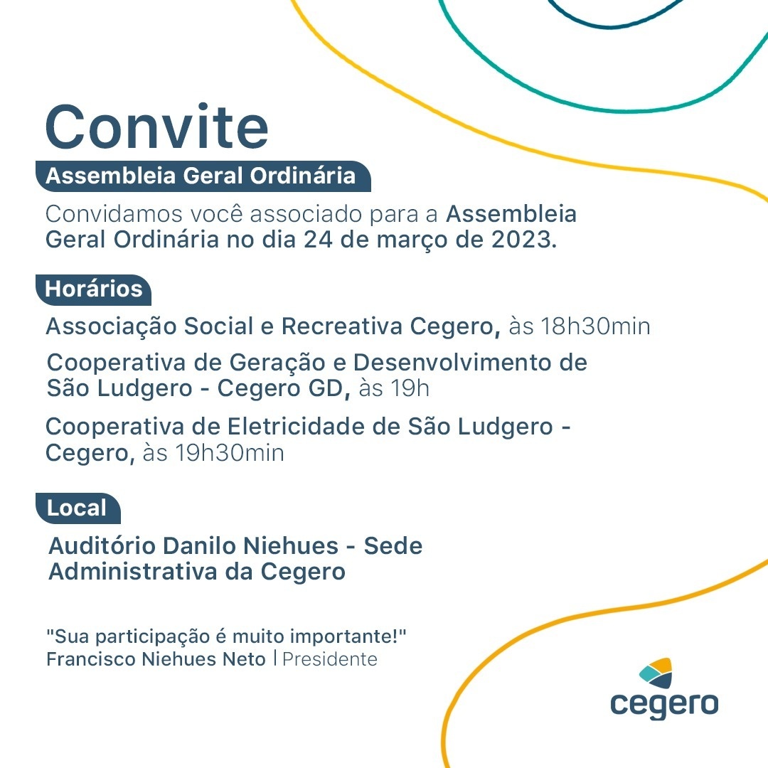 O presidente da Cooperativa de Eletricidade de São Ludgero (Cegero), da Cooperativa de Geração e Desenvolvimento de São Ludgero (Cegero GD) e da Associação Social e Recreativa Cegero (Associação Cegero), Francisco Niehues Neto, o Chico, em nome dos conselheiros, convida os associados para participarem das Assembleias Gerais Ordinárias a serem realizadas no dia 24 de março, a partir das 18h30min, no Auditório Danilo Niehues, localizado na Sede Administrativa, na rua Dona Gertrudes, nº 1.775, bairro Divina Providência, com os objetivos de apresentar os resultados econômicos, financeiros e patrimoniais, bem como os aspectos técnicos e administrativos de 2022 e os investimentos para 2023.
