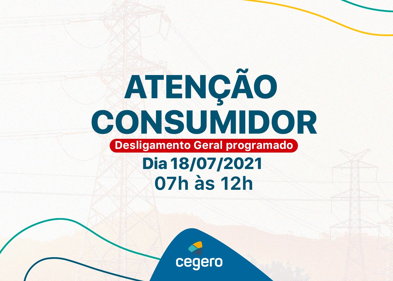 A Cooperativa de Eletricidade de São Ludgero (Cegero), comunica os seus associados e consumidores, que interromperá o fornecimento de energia elétrica em todo o seu sistema de distribuição no dia 18/07/2021 (Domingo), das 07h às 12h, para obras de ampliação e melhoria no sistema de distribuição, como também, na Subestação Cegero.