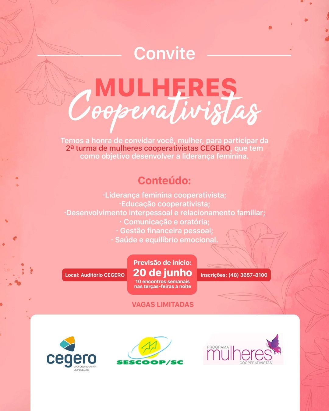 Estão abertas as inscrições para a segunda turma do programa Mulheres Cooperativistas da Cooperativa de Eletricidade de São Ludgero (Cegero), que acontece com o apoio do Serviço Nacional de Aprendizagem do Cooperativismo (Sescoop/SC). As vagas são limitadas e a previsão para o primeiro encontro é 20 de junho.