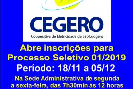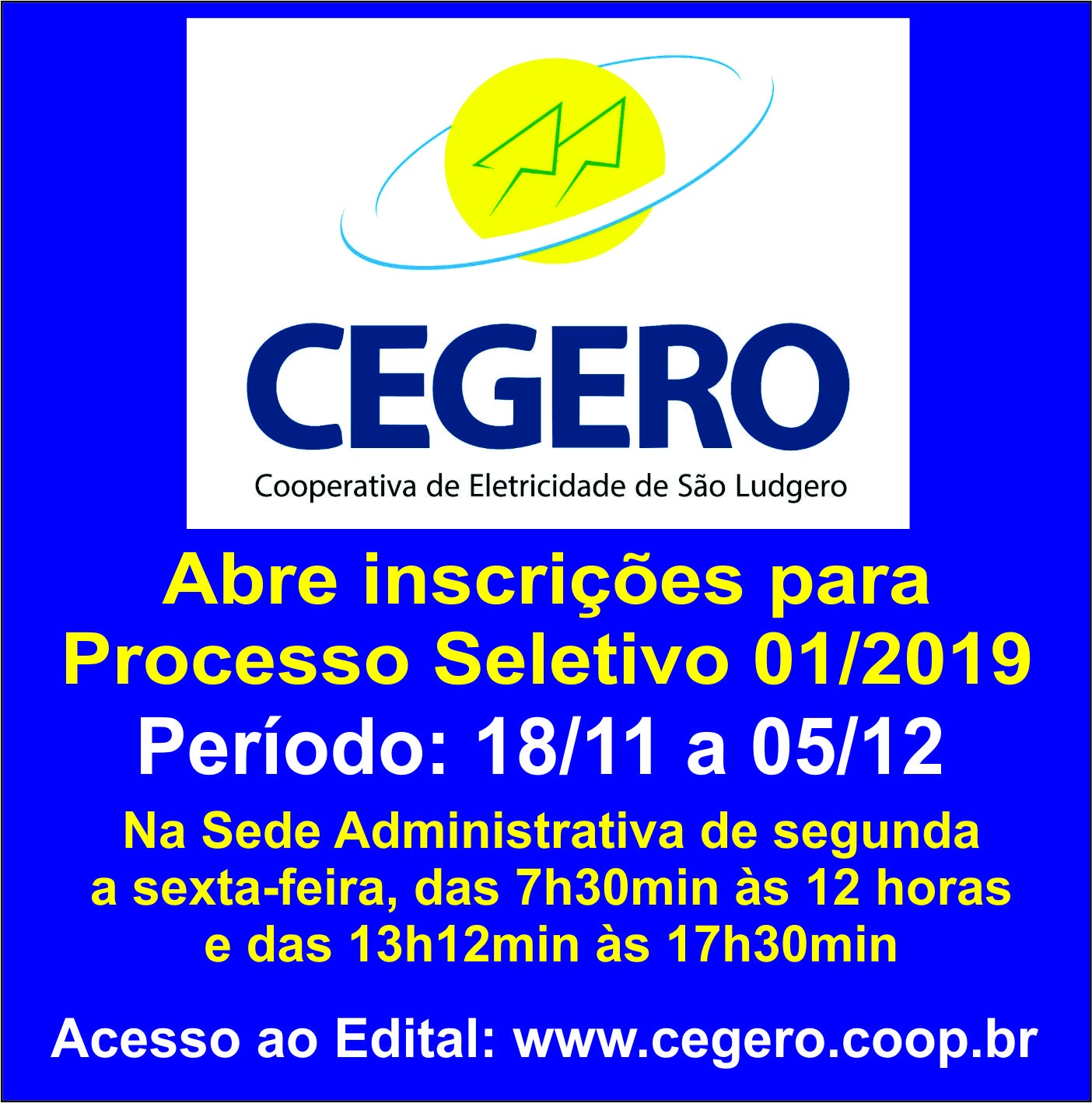 Com objetivo de contratar um profissional de imediato e formar Cadastro Reserva para Auxiliar Comercial, Auxiliar Financeiro, Auxiliar Contábil e Auxiliar de Suprimentos, a Cooperativa de Eletricidade de São Ludgero (Cegero Distribuição), abrirá inscrições, gratuitamente, no período de 18 de novembro a 5 de dezembro para Processo Seletivo. O salário ultrapassa a cifra de R$ 2,1 mil acrescido de vale-alimentação no valor de R$ 446,00, auxílio educação, seguro de vida e plano de saúde. A prova escrita será aplicada no dia 8º de dezembro, período matutino, e só passará para segunda etapa os candidatos que tirarem nota igual ou superior a 5,0.