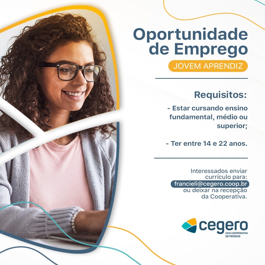 O horário é de 4 horas diárias intercaladas entre o trabalho executado na Cegero e no Serviço Nacional de Aprendizagem Industrial (Senai). O rendimento é de R$ 869,53 e a atuação acontecerá na recepção e no almoxarifado da Cooperativa.