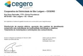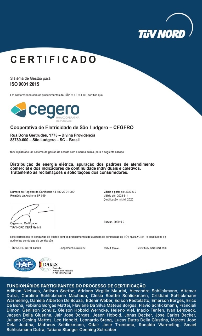 A Cooperativa de Eletricidade de São Ludgero (Cegero) está completando 57 anos de fundação (9 de agosto de 1963), e após muito empenho e dedicação, a boa notícia é que ela conquistou a certificação internacional de qualidade ISO 9001:2015.
