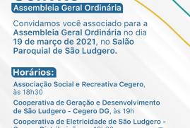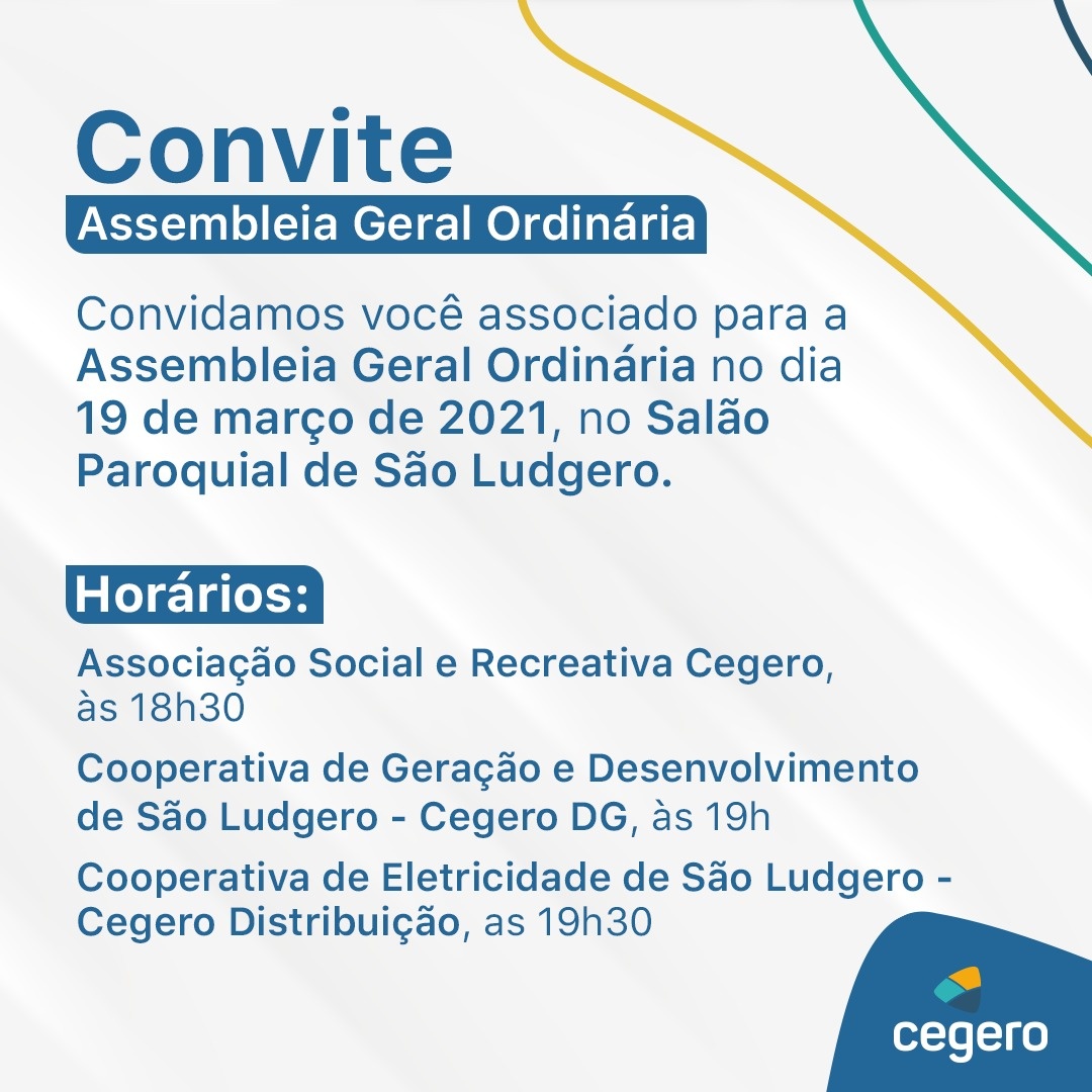 O presidente da Cooperativa de Eletricidade de São Ludgero (Cegero), a Cooperativa de Geração e Desenvolvimento de São Ludgero (Cegero GD) e Associação Social e Recreativa Cegero (Associação Cegero), Francisco Niehues Neto, o Chico, convida os associados para participarem na sexta-feira, 19 de março, a partir das 18h30min, das Assembleias Gerais Ordinárias Digitais.