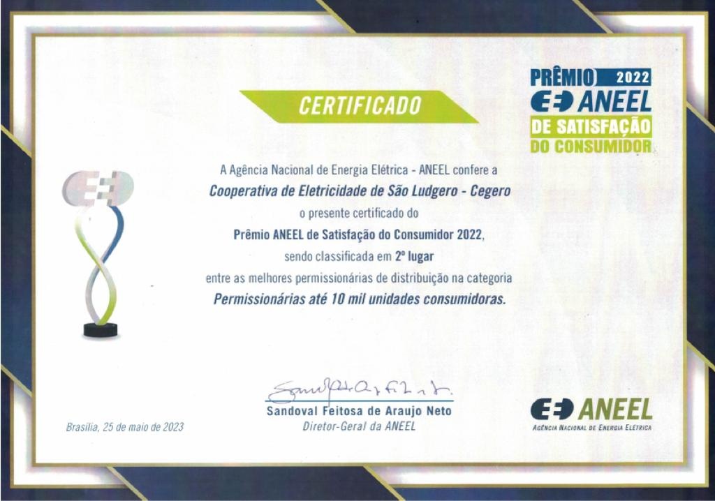 O segundo lugar até 10 mil unidades consumidoras e a sétima colocação entre as 104 distribuidoras de energia elétrica do Brasil. Esses são os resultados alcançados pela Cooperativa de Eletricidade de São Ludgero (Cegero) no Prêmio Aneel de Qualidade 2022.