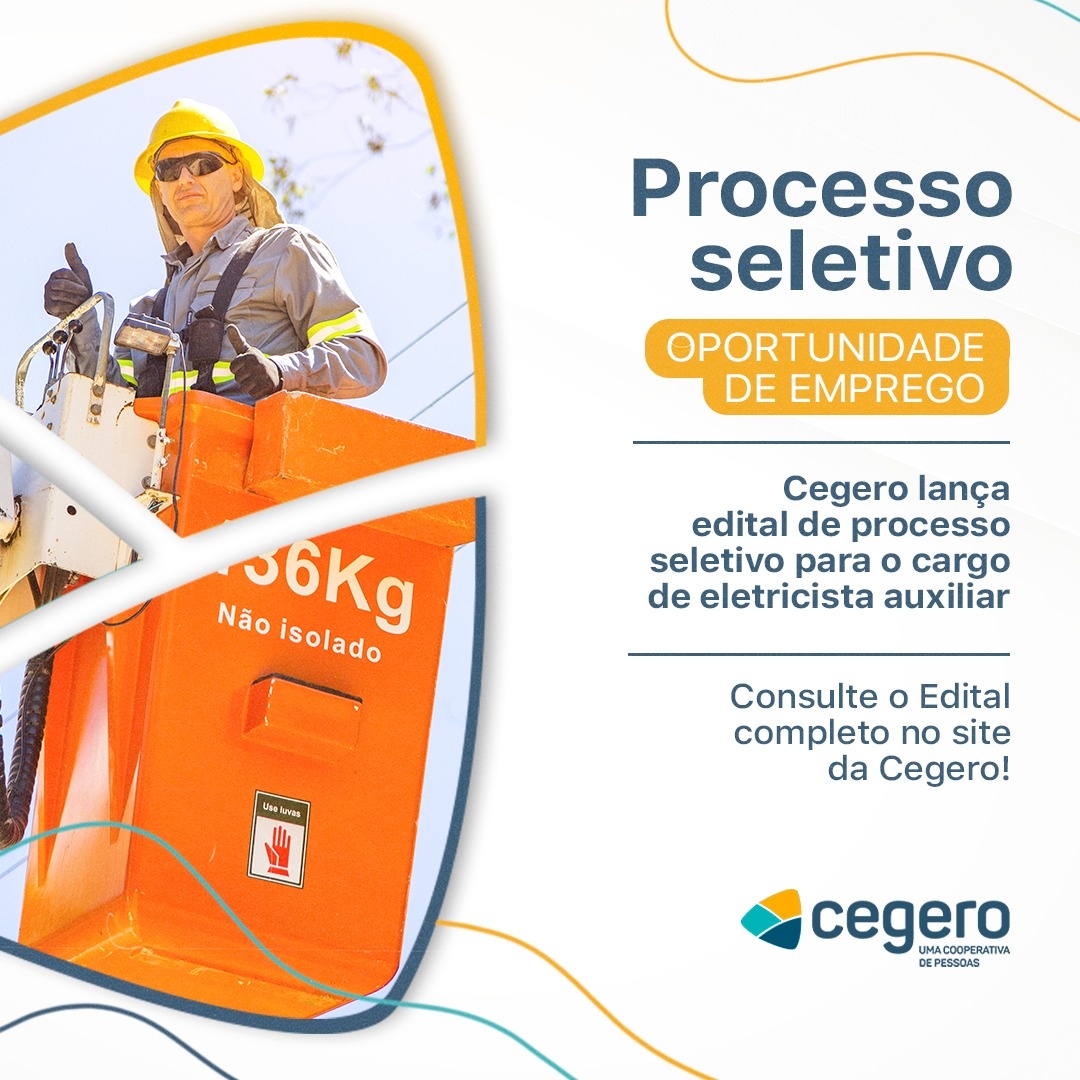 Com objetivo de preenchimento de vagas e formação de cadastro reserva para Eletricista Auxiliar, a Cooperativa de Eletricidade de São Ludgero (Cegero), estará com as inscrições abertas no período de 8 a 22 de março, gratuitamente, para o Processo Seletivo nº 01/2023. O salário inicial é de R$ 3.433,16, mais vale-alimentação de R$ 678,00, auxílio educação, seguro de vida e plano de saúde. As inscrições são gratuitas e abertas ao público, não sendo necessário ser associado ou ter vínculo.