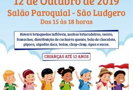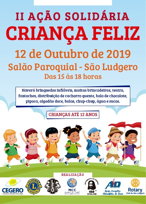 Brinquedos infláveis, teatro, fantoches, distribuição de cachorro quente, bolo de chocolate, pipoca, algodão doce, balas e chocolates, chup-chup e sucos fazem a festa delas, das crianças até 12 anos de São Ludgero, no dia delas, sábado, 12 de outubro, das 15 às 18 horas, em evento realizado no Salão Paroquial da Igreja Matriz São Ludgero. É a primeira vez que a Cooperativa de Eletricidade de São Ludgero (Cegero Distribuição) participa da ação que tem como parceiros Lions Clube, Léo Clube, Rotary Clube, Movimento de Cursilhos de Cristandade do Brasil (MCC), Movimento de Irmãos Shalom e Igreja Evangélica Assembleia de Deus.