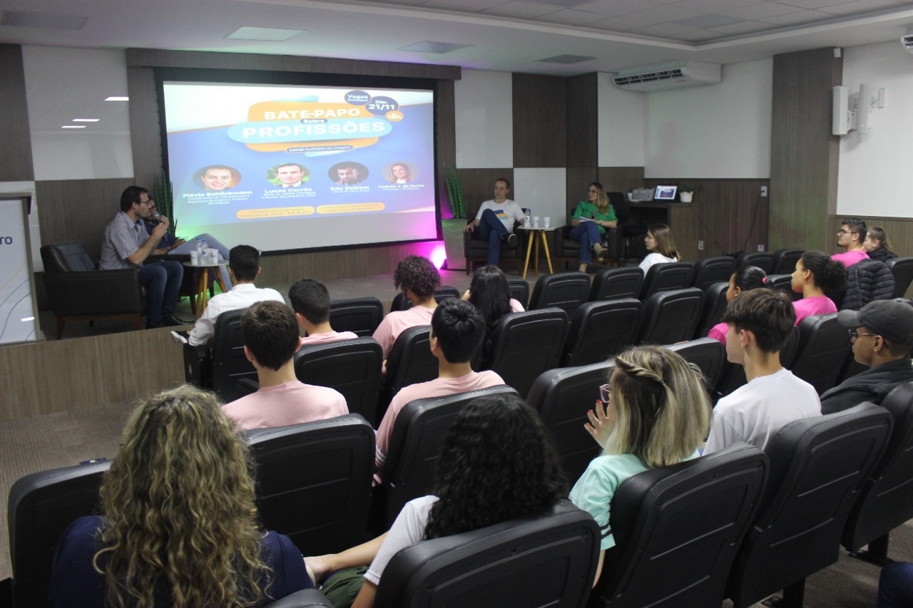 Uma experiência profunda e esclarecedora. Foi assim o resultado do bate-papo promovido pela Cooperativa de Eletricidade de São Ludgero (Cegero), entre alunos do 3º ano do ensino médio da Escola de Educação Básica São Ludgero, que integraram a segunda edição do projeto “Orientação profissional, com foco na formação de novas lideranças”, na noite do dia 21 de novembro, no Auditório Danilo Niehues, com os profissionais consolidados no mercado que atuam Lucas Corrêa, Edu Debiasi e Flávio Schlickmann. A mediação foi da psicóloga Andréia Junkes da Cunha.