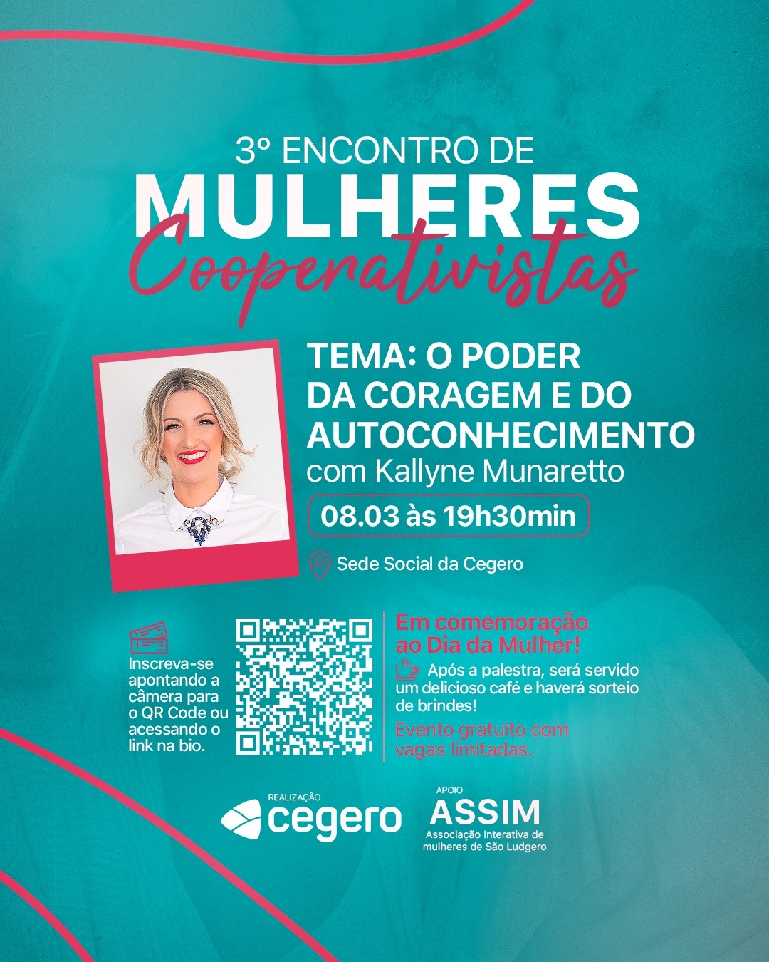 Com o tema “O poder da coragem e do autoconhecimento”, ministrada por Kallyne Munaretto, a Cooperativa de Eletricidade de São Ludgero (Cegero) promove às 19h30min do dia 8 de março, o 3º Encontro de Mulheres Cooperativistas, em comemoração ao Dia Internacional da Mulher. O evento que acontece na Sede Social da Cegero é gratuito, as vagas são limitadas, e a realização conta com o apoio da Associação Interativa de Mulheres (Assim).