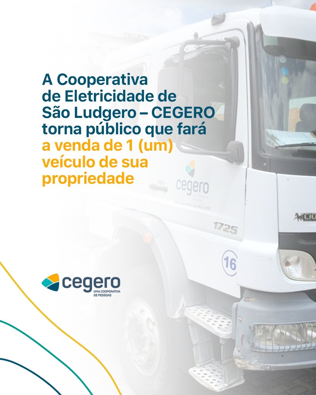 A Cooperativa de Eletricidade de São Ludgero – CEGERO torna público que fará a venda de 1 (um) veículo de sua propriedade, nas condições e características a seguir descritas: