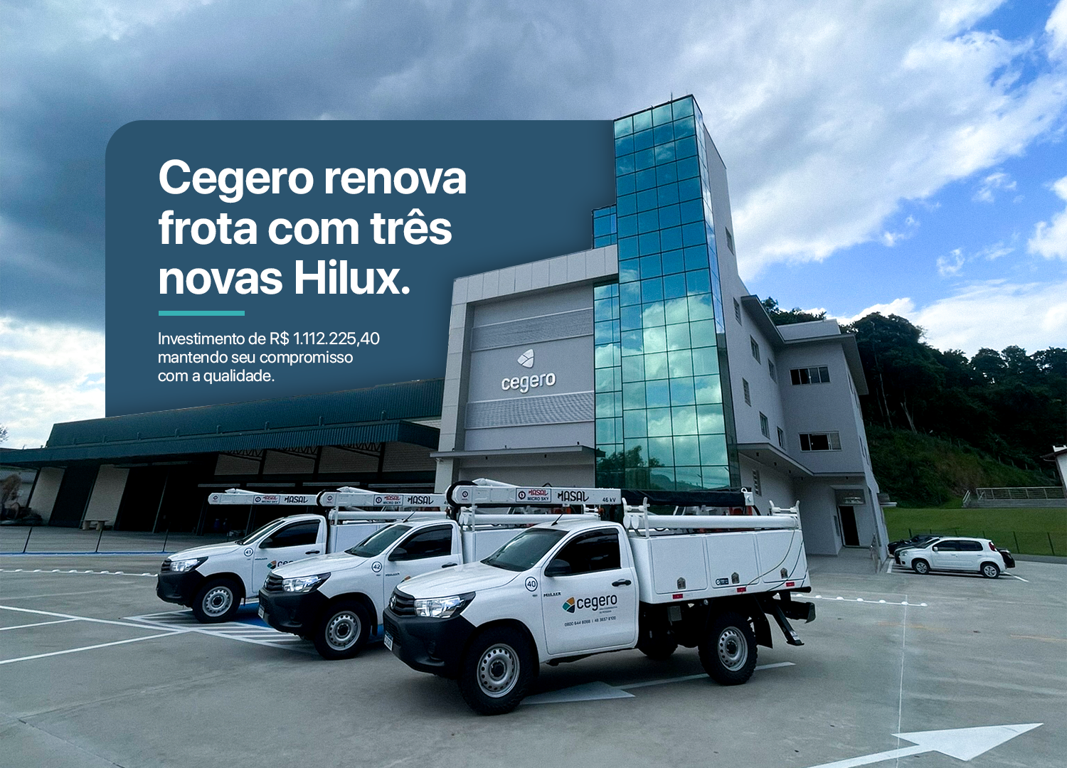 A Cooperativa de Eletricidade de São Ludgero (CEGERO) realizou a renovação de sua frota com a aquisição de três novas caminhonetes Toyota Hilux 4x4 zero km, equipadas com Cesto aéreo Masal 10MTS com isolamento para 46kV e pneus off-Road, um investimento que totalizou R$ 1.112.225,40.