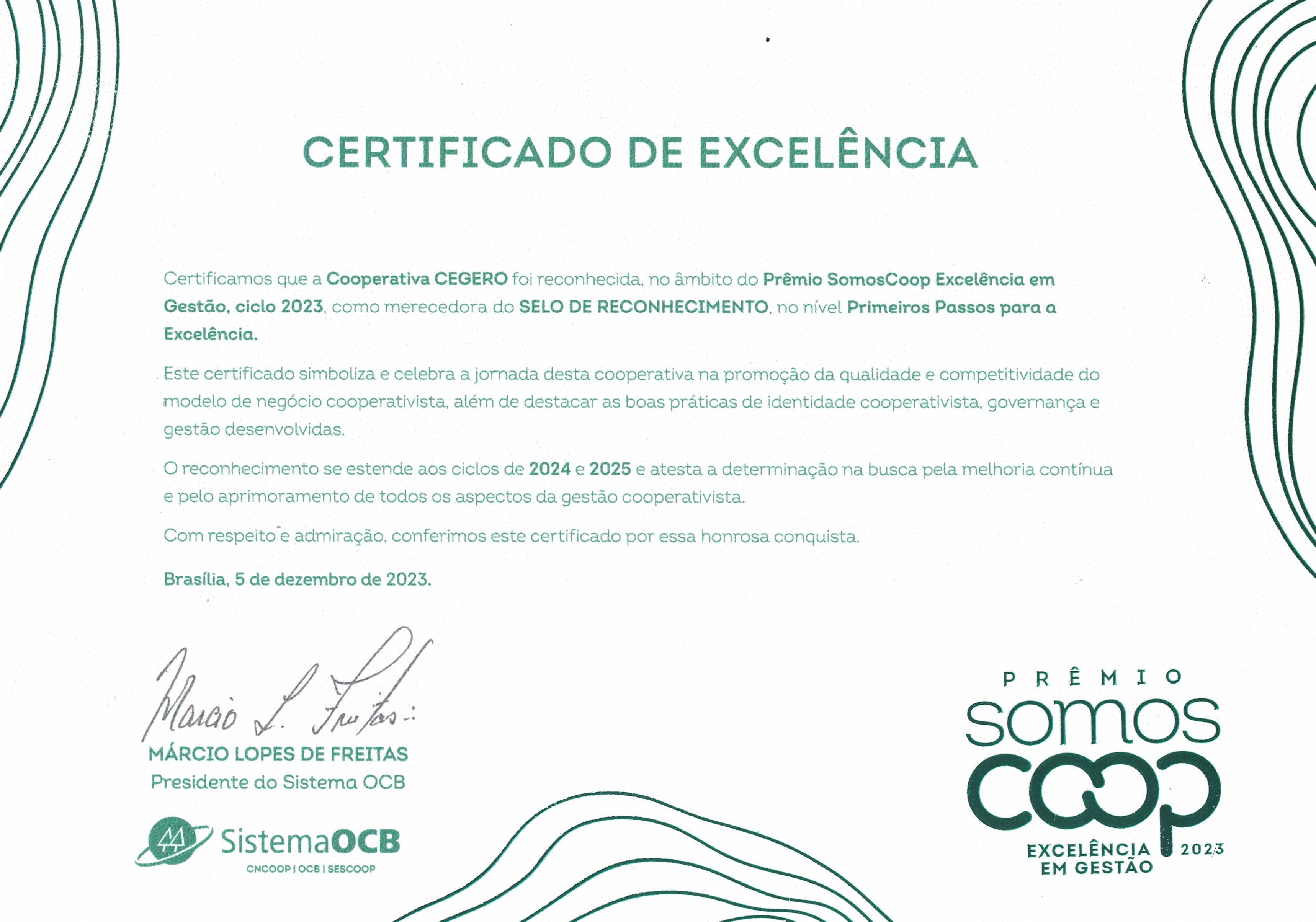 O Certificado SomosCoop Excelência em Gestão, que tem a chancela do presidente da OCB Márcio Lopes de Freitas, confirma que a Cegero está alinhada as melhores práticas de gestão da atualidade. Trata-se do reconhecimento público em nível nacional das cooperativas que mais promovem o aumento da qualidade e da competitividade por suas boas práticas de identidade, governança, gestão, responsabilidade socioambiental e de desenvolvimento humano.