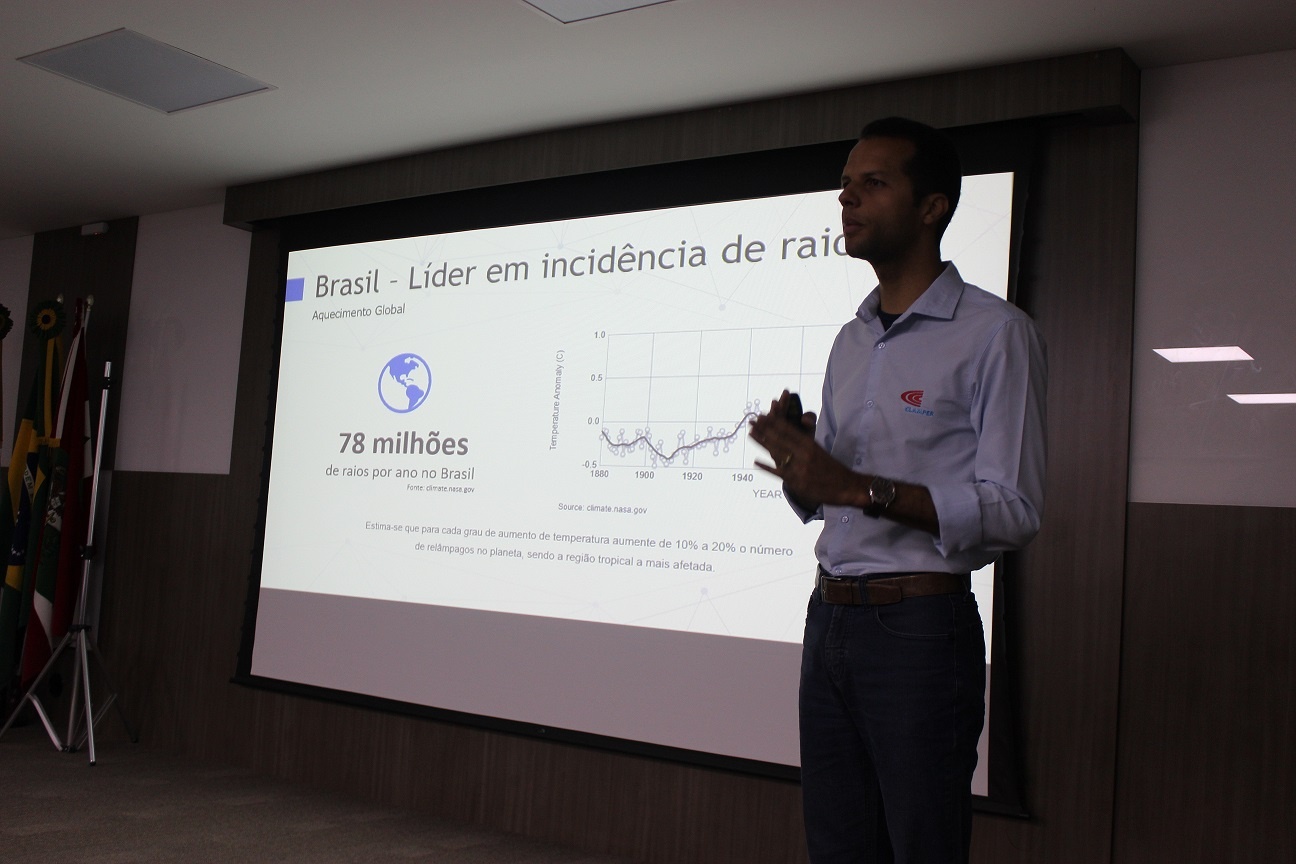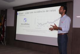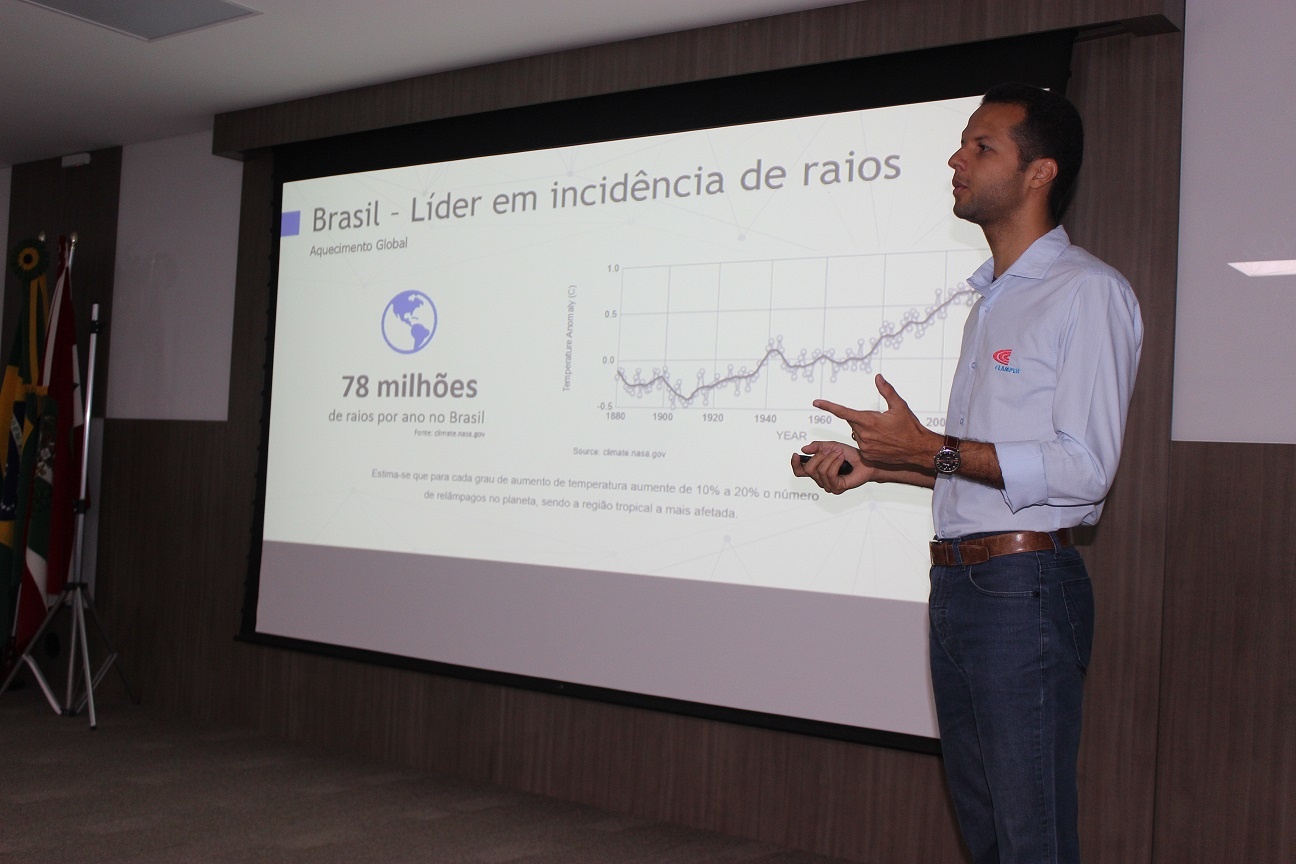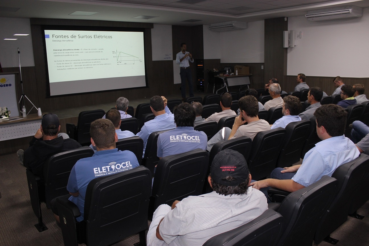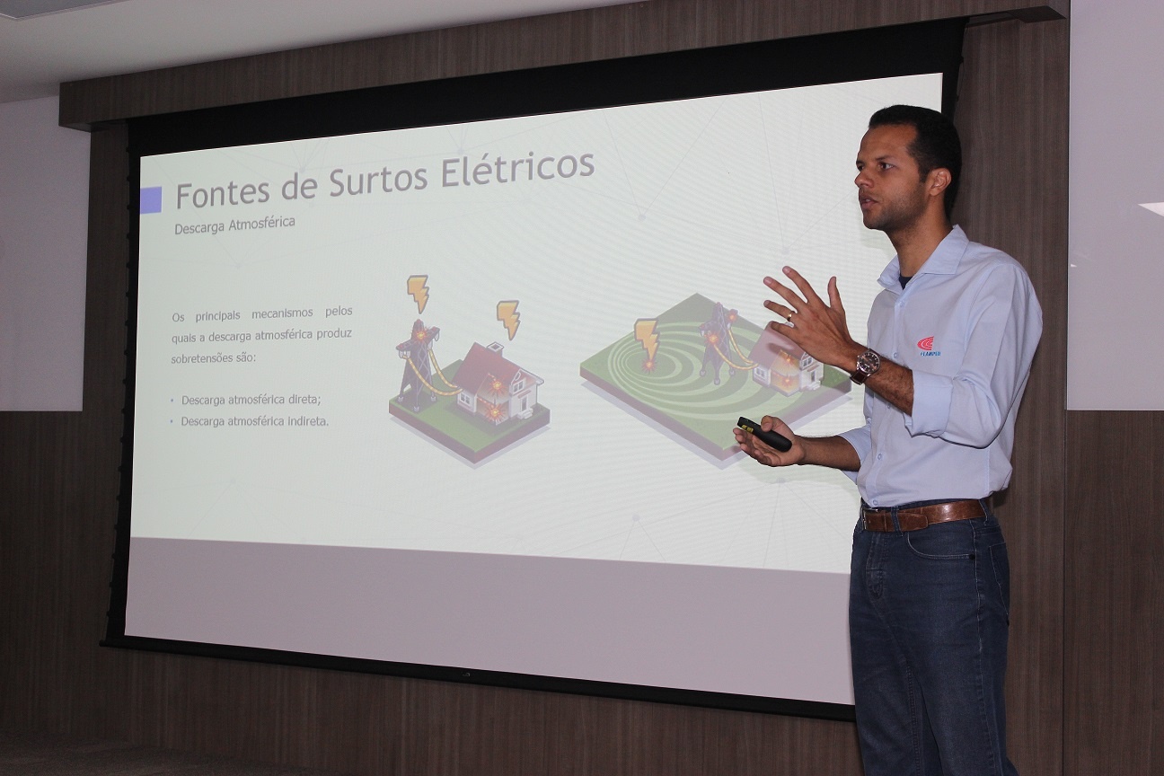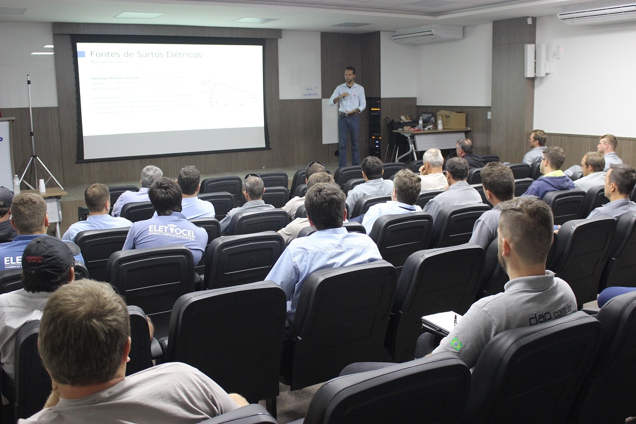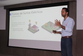 O palestrante durante o evento contextualizou de forma geral as ações, consequências e ferramentas existentes para combater os surtos elétricos causados por descargas atmosféricas, manobras de rede e liga/desliga de máquinas, entre outros. Explicou que o Dispositivo de Proteção contra Surtos (DPS) é um dos equipamentos que contribuem para que as sobretensões transitórias na rede elétrica desviem as correntes de surtos.