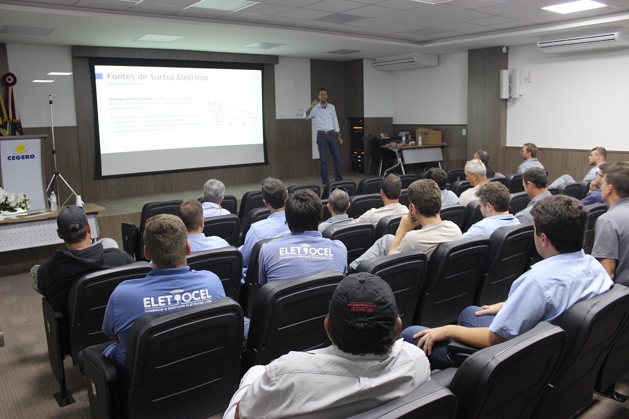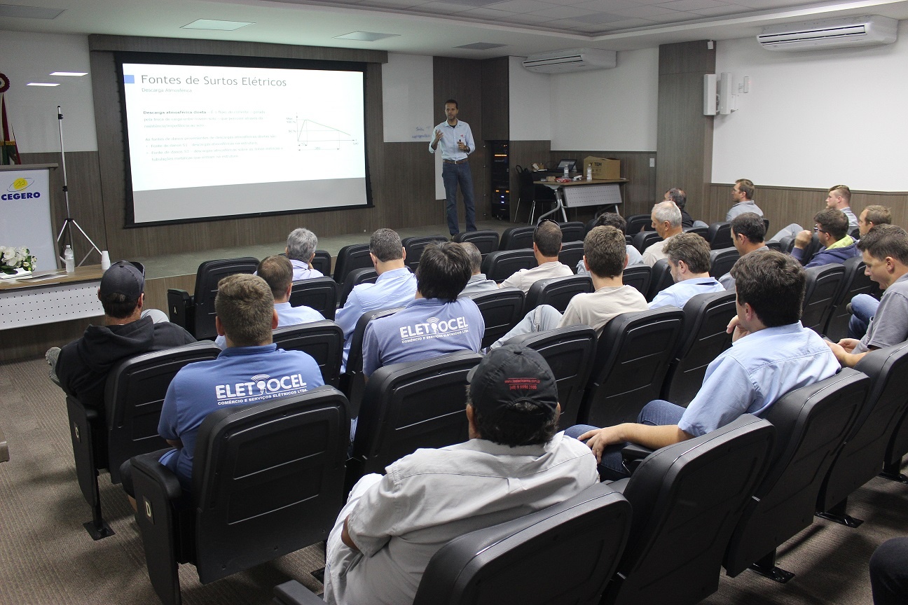 Com a participação de mais de 40 profissionais a palestra “Dispositivos de Proteção contra Surtos” ministrada por Renato Teixeira, da empresa Clamper, profissional participante de grupos de revisão de normas ABNT e com vasto conhecimento de proteção de surtos e aterramento, promovido pela Cooperativa de Eletricidade de São Ludgero (Cegero Distribuição), em sua Sede Administrativa, no Auditório Danilo Niehues, das 8 às 11h30min, no dia de hoje, segunda-feira, 28 de outubro, alcançou o objetivo inicial que era oportunizar conhecimento e informação que visam a melhora da segurança e proteção dos equipamentos elétricos nas residências de associados e consumidores.