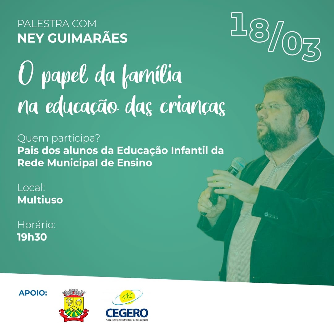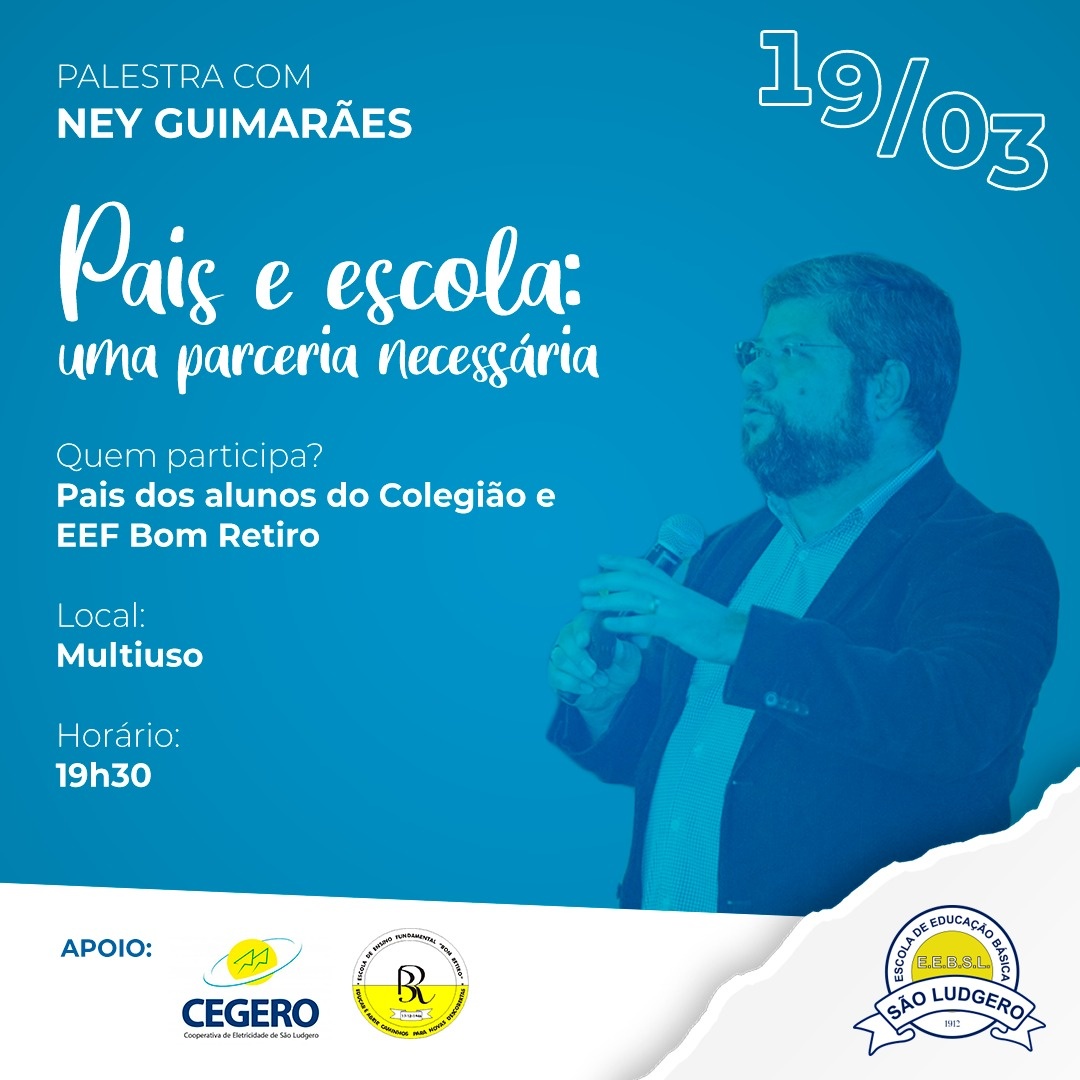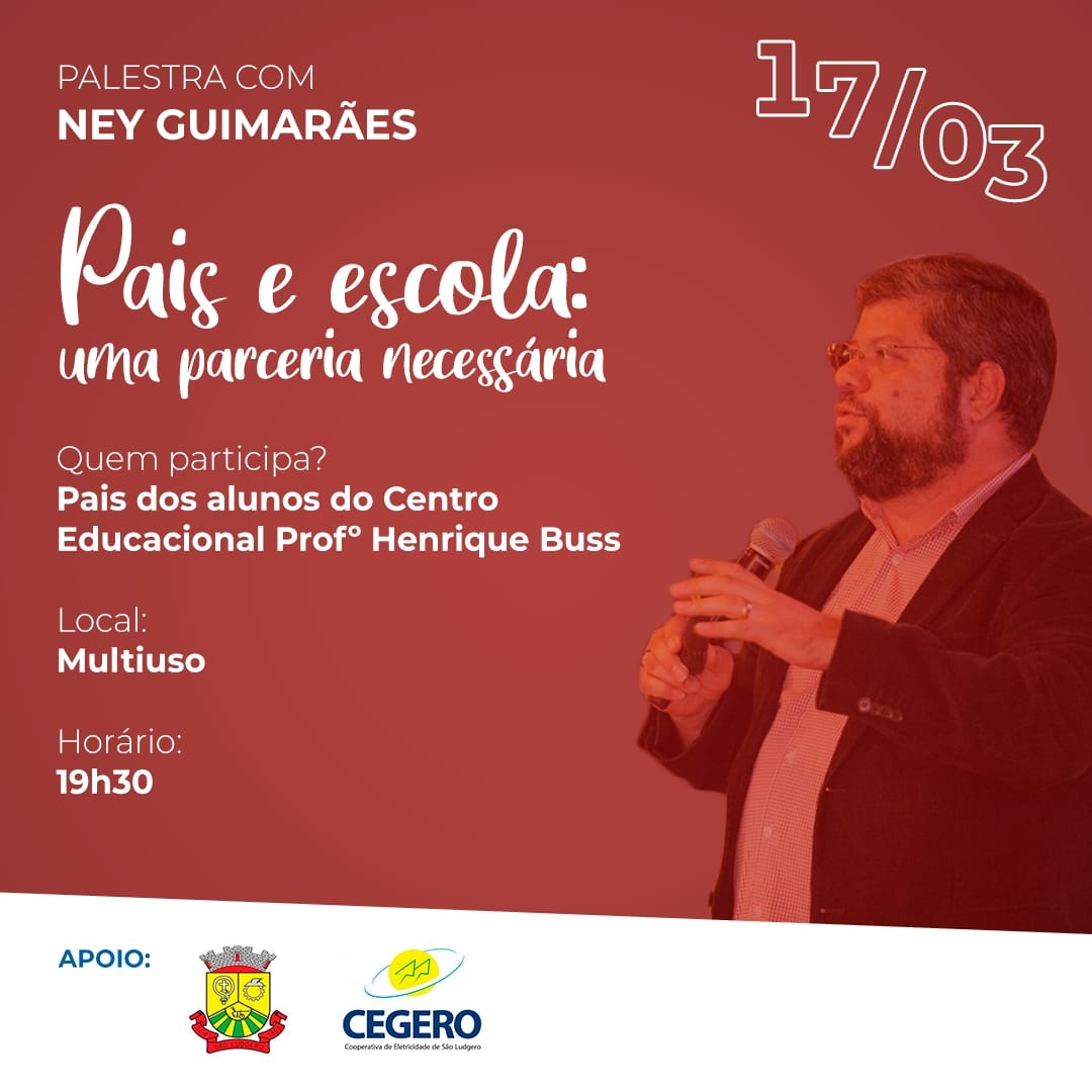 Os pais e as famílias dos alunos que frequentam as Redes Municipal e Estadual de Ensino em São Ludgero são foco das palestras gratuitas que serão ministradas nos dias 17, 18 e 19 de março pelo renomado professor Ney Guimarães. A viabilização do palestrante é uma iniciativa da Cooperativa de Eletricidade de São Ludgero (Cegero) com o apoio na disponibilização de espaço e mobilização da Prefeitura, através da Secretaria de Educação, e as direções das Escolas de Educação Básica São Ludgero e Ensino Fundamental Bom Retiro.