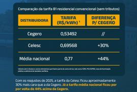 Atualmente, a tarifa da Celesc é cerca de 30% mais cara e a tarifa média nacional está 44% acima da Cegero.
