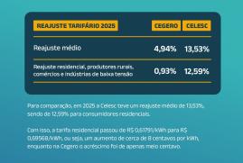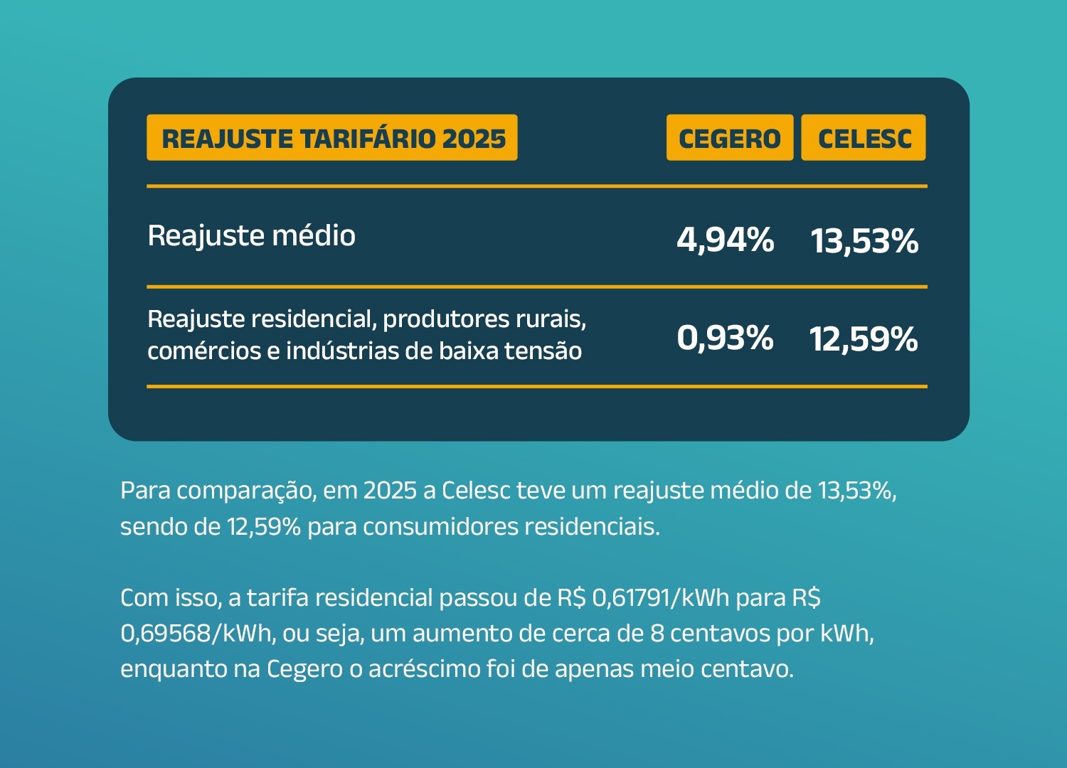 Para comparação, a Celesc teve reajuste médio de 13,53% em agosto de 2025, sendo de 12,59% para consumidores residenciais. Com isso, a tarifa residencial passou de R$ 0,61791/kWh para R$ 0,69568/kWh, ou seja, um aumento de cerca de 8 centavos por kWh, enquanto na Cegero o acréscimo foi de apenas meio centavo.