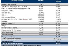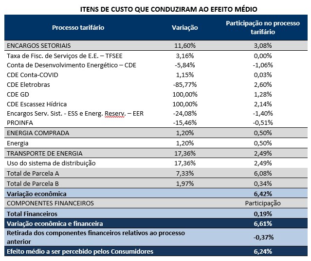 O efeito médio do reajuste a ser percebido pelos consumidores será de 6,24%. Para os consumidores faturados em Baixa Tensão o efeito médio será de 7,94%, sendo de 6,61% para os consumidores residenciais. Já para os consumidores faturados em Alta Tensão o efeito médio será de 5,74%.