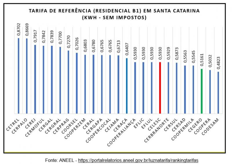 “Em 2017, a Cegero possuía 53,34% de desconto na compra de energia da Celesc, valor que chegou a ser de 67,35%. Por força da legislação, esses descontos passaram a ser reduzidos gradativamente no decorrer dos anos e nossa preocupação foi a de conseguir fazer uma transição que permitisse à Cegero se manter com a tarifa abaixo da Celesc e se possível entre as 5 mais baratas do Brasil. Em setembro de 2023 continuamos entre as mais baratas do Brasil e 13% abaixo da Celesc.”