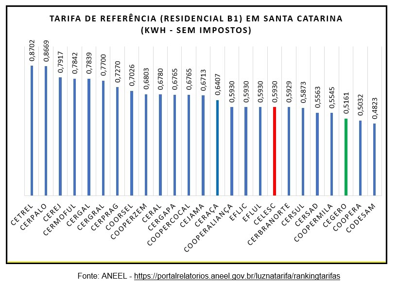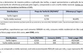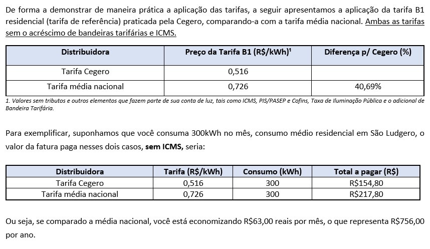 De forma a demonstrar de maneira prática a aplicação das tarifas, a seguir apresentamos a aplicação da tarifa B1 residencial (tarifa de referência) praticada pela Cegero, comparando-a com a tarifa média nacional. Ambas as tarifas sem o acrescimo de valores sem tributos e outros elementos que fazem parte de sua conta de luz, tais como ICMS, PIS/PASEP e Cofins, Taxa de Iluminação Pública e o adicional de Bandeira Tarifária.