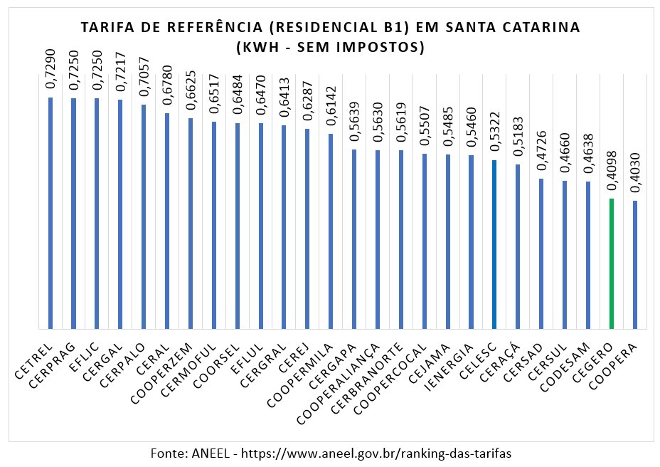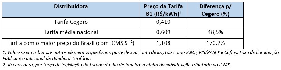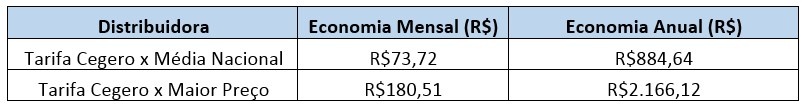 De forma a demonstrar de maneira prática a aplicação das tarifas, a seguir apresentamos a aplicação da tarifa B1 residencial (tarifa de referência) praticada pela Cegero, comparando-a com a tarifa média nacional. Segue também uma comparação com a maior tarifa praticada entre as 105 distribuidoras do Brasil. Ambas as tarifas sem o acréscimo de bandeiras tarifárias.