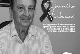 "Estou feliz por tudo que ajudei a construir em mais de três décadas com os sócios, funcionários, conselheiros e membros das diretorias que formaram a Cegero". A frase foi uma das últimas declarações públicas feita por Danilo Niehues que faleceu, vítima de complicações da Covid-19, a uma hora da madrugada de hoje, quinta-feira, 18 de março, no Hospital Socimed, com 87 anos. Deixou esposa, 5 filhos, 9 netos e 2 bisnetas. Ele também foi prefeito de São Ludgero no período de 1º de fevereiro de 1983 a 31 de dezembro de 1988. O velório acontece das 9 às 11 horas na Capela Mortuária da Igreja Matriz São Ludgero e, logo após, o sepultamento no Cemitério Municipal. O prefeito de São Ludgero, Ibaneis Lembeck, o Iba, decretou luto oficial por 3 dias.