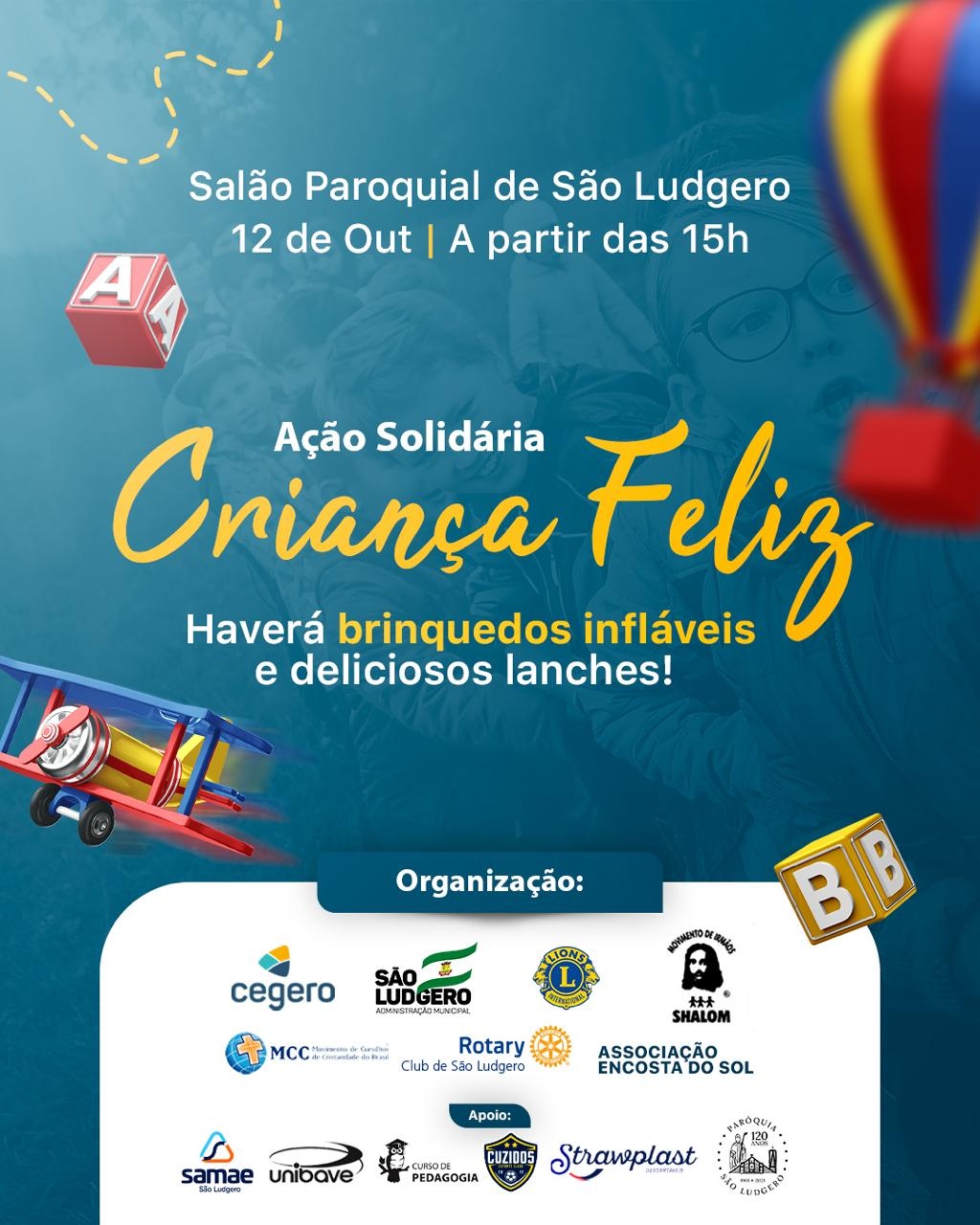 Com o objetivo de celebrar a data de forma marcante e especial, São Ludgero se une e no dia 12 de outubro, Dia das Crianças, realiza no Salão Paroquial da Igreja Matriz, a ação solidária “Criança Feliz”. A organização é da Cooperativa de Eletricidade de São Ludgero (Cegero), Prefeitura Municipal, Lions Clube, Rotary Club, Movimento de Irmãos, Cursilho de Cristandade e Associação Encosta do Sol, com o apoio da Paróquia de São Ludgero, Samae, Unibave/Curso de Pedagogia, Cuzidos Esporte Clube e Strawplast.